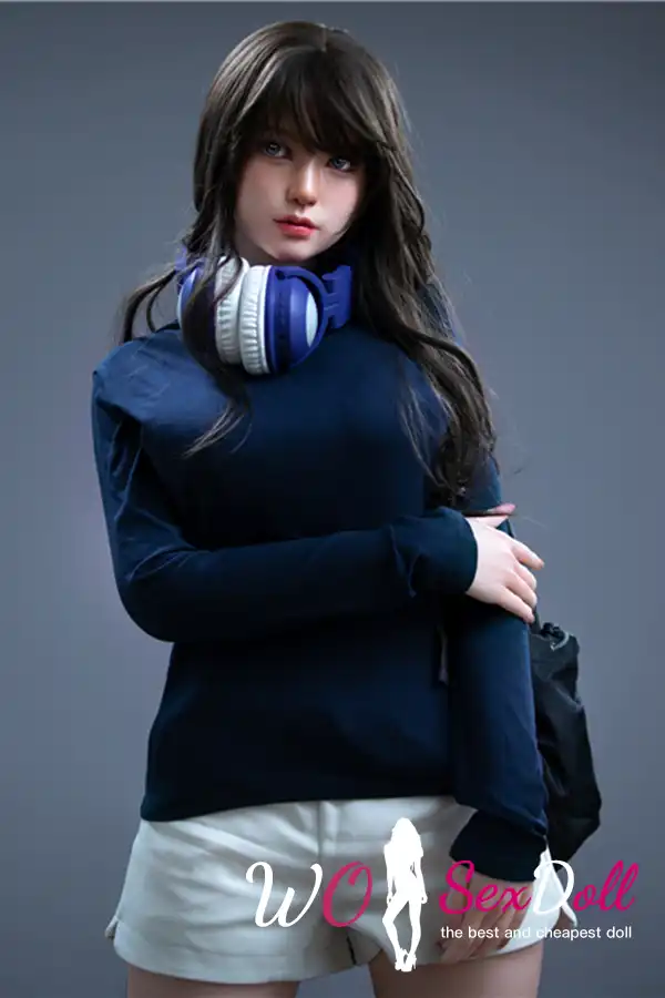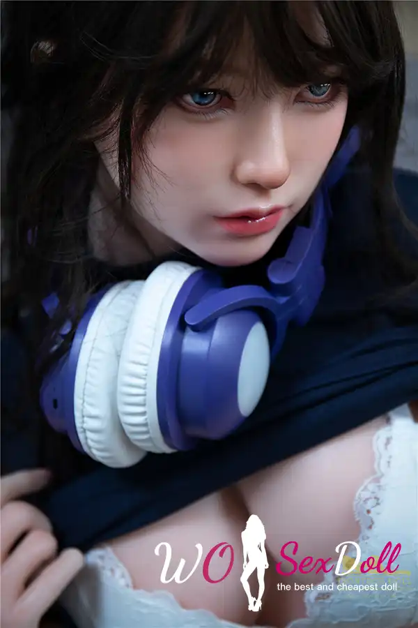 This silicone anime gamer style sex doll e cup dressed in casual hoodie with cat ear headphones. A cute gamer girl look, perfect for anime cosplay fantasies.