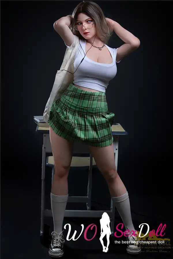 This silicone busty schoolgirl sex doll f cup with glasses, uniform skirt, and large breasts. Perfect for classroom roleplay and naughty fantasies.