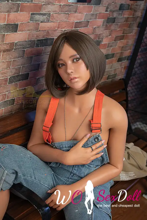 This silicone exotic tan skin sex doll a cup with short brown hair and casual overalls. A hot street-style beauty with bold charm.